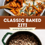 Warm, hearty, and easy to prepare, this Baked Ziti recipe layers tender ziti pasta with a rich tomato-sausage sauce, creamy melted mozzarella, and sharp Parmesan cheese. Baked to bubbly golden perfection, it’s ideal for cozy dinners, weeknight meals, or feeding a crowd.