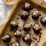 Take your peanut butter-filled and chilled dates from the freezer. Using two forks, carefully dip each one entirely into the melted chocolate, letting any excess drip off before placing them back on your lined pan. Immediately sprinkle more chopped peanuts and a pinch of flaky sea salt on top while the chocolate is still wet so everything sticks perfectly.