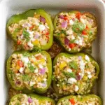 To reheat, place the stuffed peppers in a baking dish, cover with foil, and warm in a 350℉ oven for about 20 minutes or until heated through. Alternatively, use the microwave for a quick meal, though oven reheating keeps the texture nice and fresh.