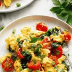 This Greek Scrambled Eggs recipe combines fluffy scrambled eggs with fresh vegetables and tangy feta cheese for a wholesome and flavorful breakfast or brunch option. Quick to prepare and packed with Mediterranean flavors, it features grape tomatoes, baby spinach, green onions, garlic, and a sprinkle of fresh parsley garnish.
