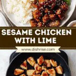 A quick and healthy sesame chicken recipe featuring tender cubed chicken breasts sautéed and coated in a flavorful sauce made with coconut aminos, honey, sesame oil, and lime. Served over steamed white rice and green beans for a balanced meal.