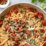 A simple and vibrant pasta dish featuring al dente spaghetti tossed with a fresh, flavorful cherry tomato sauce infused with garlic, crushed red pepper, and fresh basil, finished with grated Parmesan cheese. Ready in 15 minutes, it’s a perfect quick meal full of bright, summery flavors.