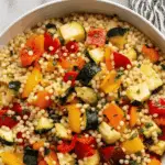 A vibrant and wholesome Roasted Vegetable Lemon Tahini Couscous recipe featuring perfectly roasted zucchini, yellow squash, and bell peppers tossed in a zesty lemon tahini dressing. This easy, flavorful dish combines toasted pearl couscous with fresh herbs and a creamy dressing, making it a perfect light meal or side dish.