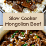 Tender, flavorful Mongolian beef made effortlessly in the slow cooker. Thinly sliced flank steak simmers in a savory-sweet soy, garlic, and ginger sauce until melt-in-your-mouth, then finishes with fresh green onions.