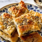 This Spinach and Feta Cheese Börek – Turkish Borek Recipe shines with just a few simple garnishes. Sprinkle freshly chopped parsley or dill over the top to add freshness and a burst of bright color. A dollop of cool yogurt or tzatziki on the side complements the warm, flaky börek perfectly, balancing the richness with refreshing creaminess.