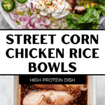 This Street Corn Chicken Rice Bowl combines juicy grilled chicken breasts marinated in a flavorful soy and garlic mixture, with a vibrant street corn salad featuring grilled corn, feta, cotija cheese, and a zesty lime dressing. Served over a bed of fluffy rice and topped with fresh cilantro, jalapeño slices, and avocado, this recipe delivers a deliciously satisfying meal perfect for a casual lunch or dinner.